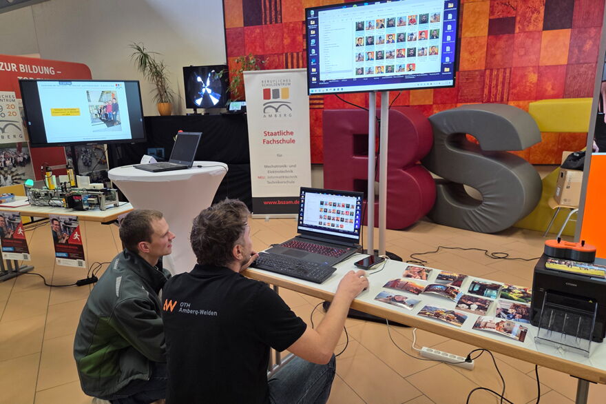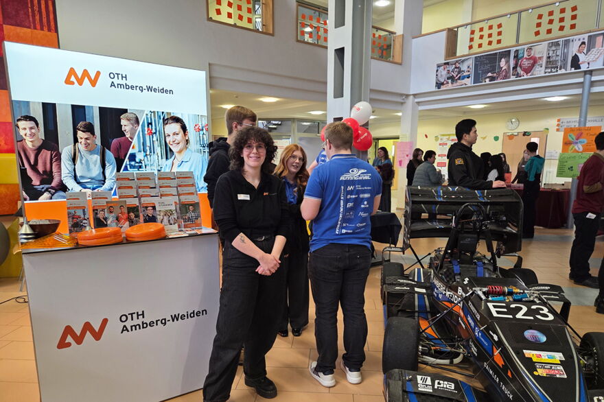 Besonders stolz war die Schule auf die erneute Präsenz der OTH Amberg‑Weiden. Der Running‑Snail‑Rennwagen und die KI‑Fotogenerierung zogen viele Interessierte an und boten spannende Gespräche über mögliche Studiengänge nach der Zeit an der FOSBOS.