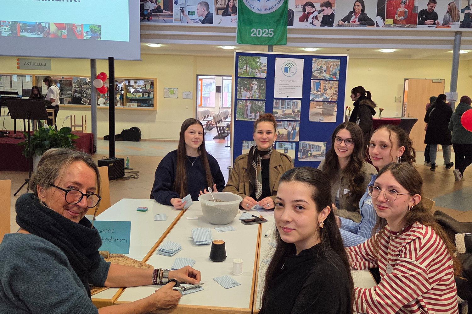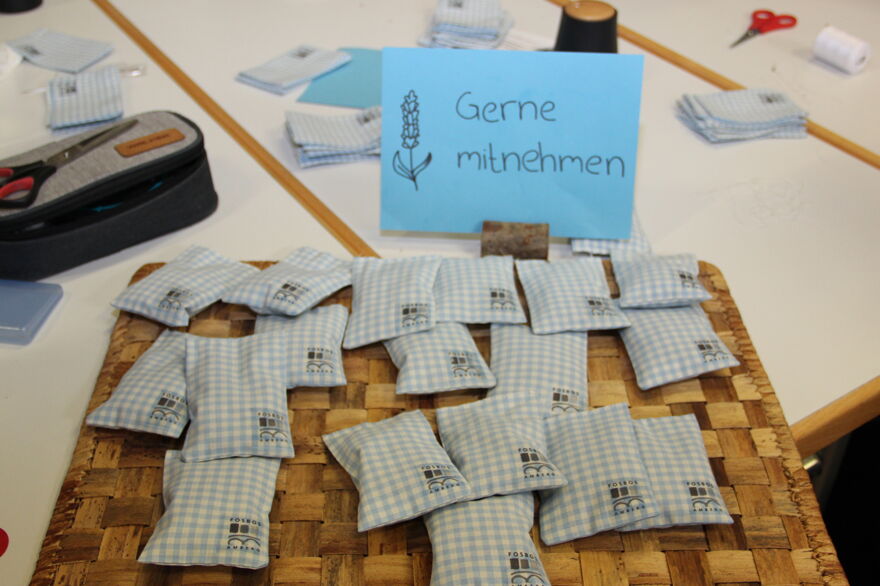 Seit nunmehr drei Jahren ist die FOSBOS auch Umweltschule, und so bastelte die Umweltgruppe dieses Jahr wieder live in der Aula. Nachdem im vergangenen Jahr ein großes Lavendelbeet im Innenhof der Schule angelegt worden war, wurde die Lavendelernte in selbst genähten Beuteln abgefüllt und an die Gäste verschenkt.