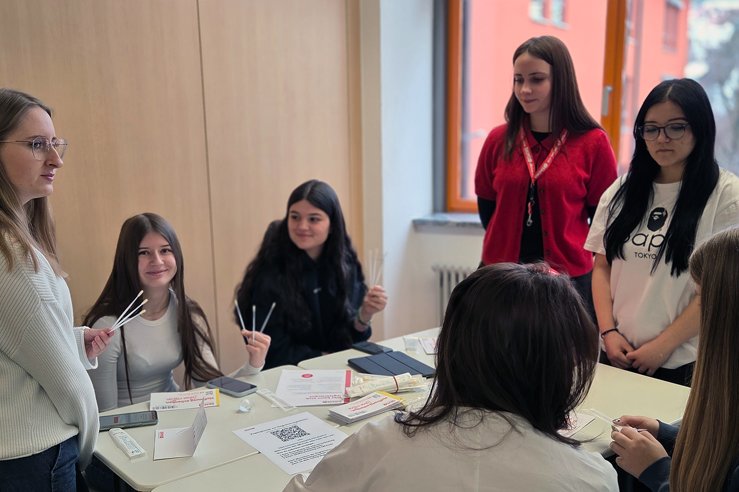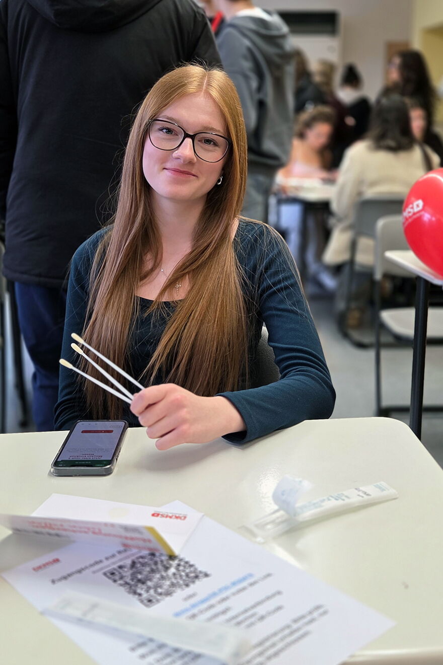 Auch an der Berufsschule wurde die DKMS-Aktion im Rahmen einer Projektwoche durchgeführt. In 22 Klassen fanden über die Woche verteilt Informationsveranstaltungen mit anschließender Registrierungsmöglichkeit statt. Die Gesundheitsklassen der Berufsschule und der FOS gestalteten die Besuche gemeinsam, erklärten medizinische Hintergründe verständlich und begleiteten die Typisierungen vor Ort. Die Verbindung aus fachlichem Wissen und authentischer Ansprache auf Augenhöhe erwies sich als besonders wirkungsvoll.