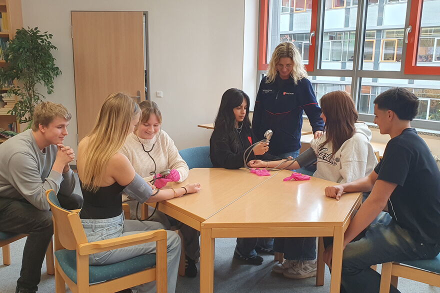 Unter Anleitung des Malteser-Teams lernten die Jugendlichen wichtige Grundlagen der Pflege – von der körperlichen Grundpflege über den Umgang mit pflegebedürftigen Menschen bis hin zu Themen wie Hygiene, Lagerung, Vitalzeichenkontrolle und Kommunikation im Pflegealltag. Auch theoretische Inhalte wie rechtliche Aspekte und der respektvolle Umgang mit Patientinnen und Patienten wurden ausführlich erläutert und durch viele Beispiele aus dem Pflegealltag veranschaulicht. Besonders eindrucksvoll war, wie viel Verantwortung Pflegende täglich übernehmen und wie wichtig Empathie und Aufmerksamkeit in diesem Berufsfeld sind.