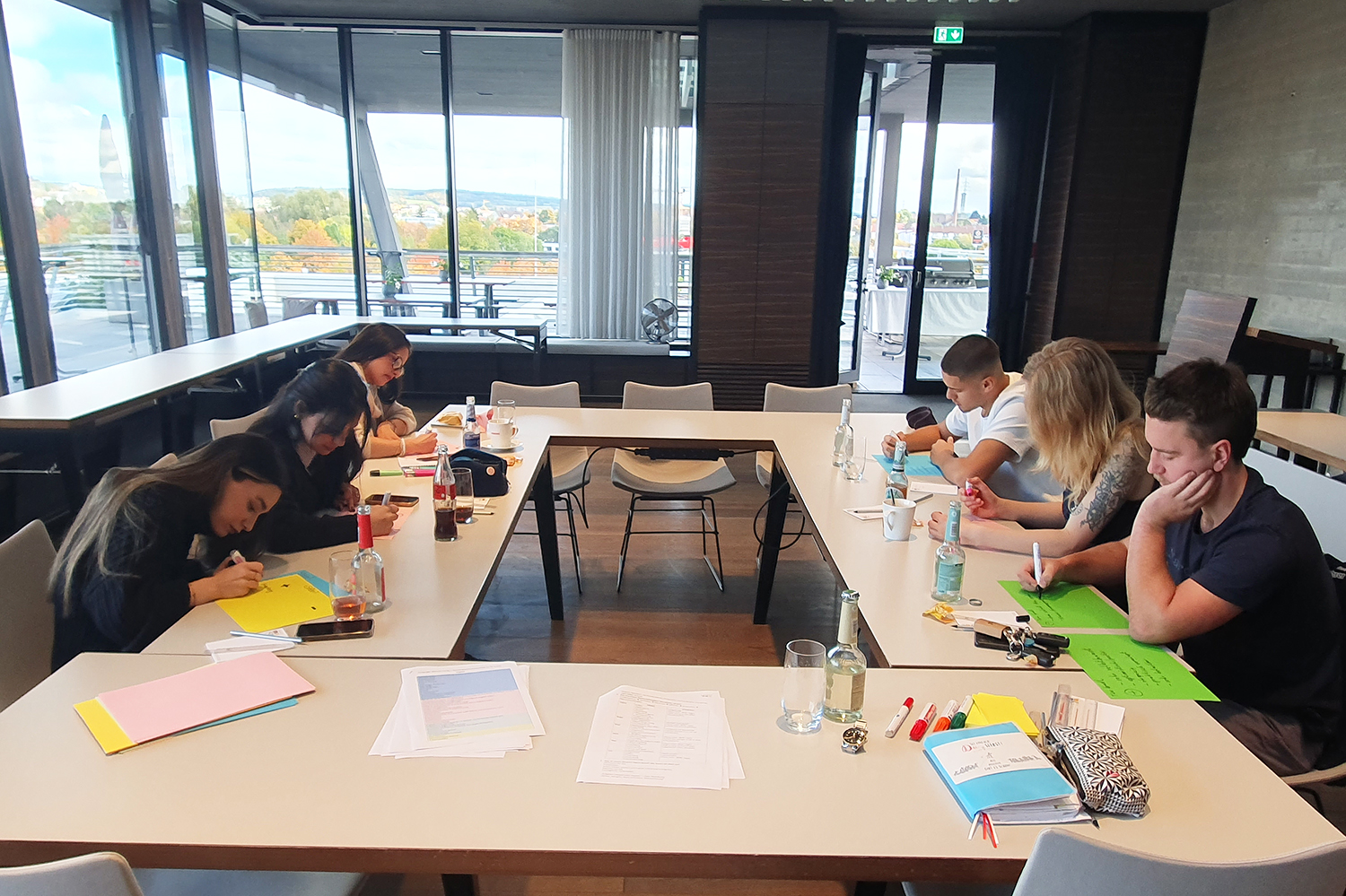 Die Schülersprecherinnen und Schülersprecher – Theo Gradl (BT12), Eva Richthammer (BSW12), André Sena-Seitz (FW12b), Shazi Jamal (B11/FB10), Darin Mohammed Salih (FG11a) und Leilani Saalbach (FS12b) – entwickelten gemeinsam erste Konzepte für Aktionen und Projekte, die das Schulleben bereichern sollen. Am Nachmittag kamen weitere engagierte Klassensprecherinnen und Klassensprecher hinzu: Michael Graf (FW12a), Amely Urland (FW12a) und Adam Farid (FT11a). Auch sie möchten sich aktiv in die SMV-Arbeit einbringen.
