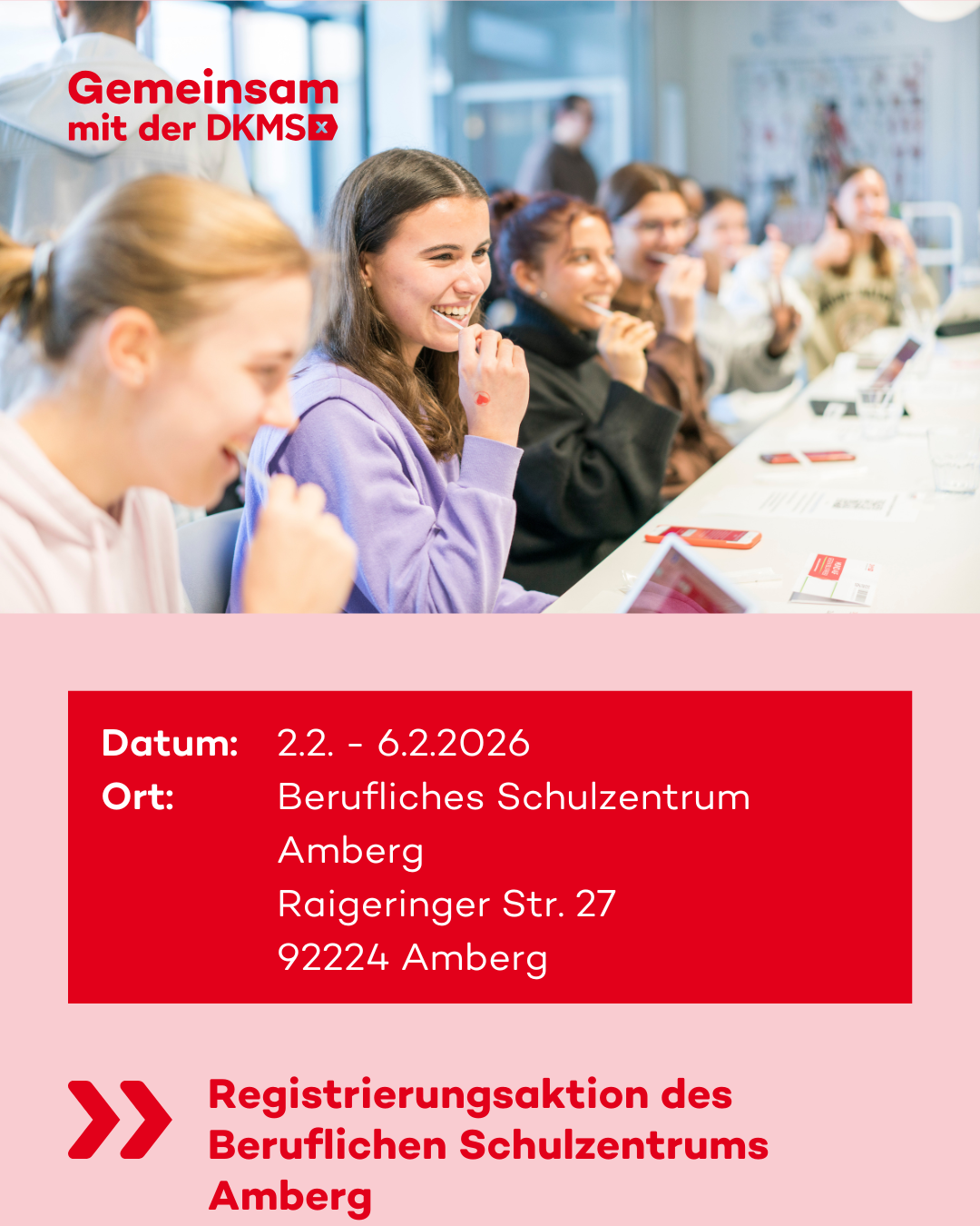 Gemeinsam mit der DKMS engagiert sich das BSZ Amberg vom 02. bis 06. Februar 2026 im Kampf gegen Blutkrebs. Schülerinnen und Schüler ab 17 Jahren können sich freiwillig als Stammzellspenderinnen und ‑spender registrieren lassen. Genauere Informationen finden Sie hier: Elterninfo BSZ Amberg und Aktionsflyer Amberg